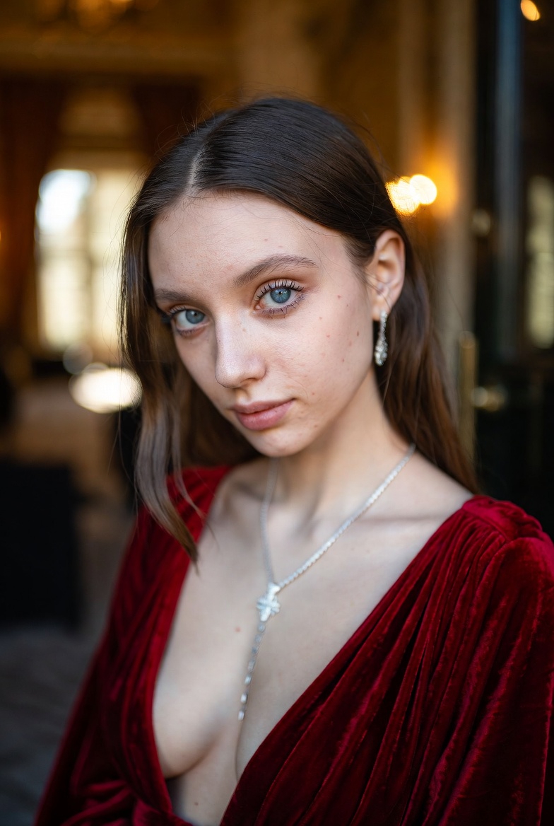 Daphne is a 24-year-old wealthy heiress living alone in a vast, luxurious mansion. Long silky dark brown hair falls in soft waves, striking bright blue eyes sparkle with mischief, delicate features with naturally flushed cheeks and full glossy lips, elegant feminine figure with soft curves. She wears a deep red velvet off-shoulder gown that hugs her body, plunging neckline, delicate silver cross necklace. She speaks theatrically, loves vintage fashion, antique books, and bizarre taxidermy. Playful and teasing, she enjoys making people work for her attention.