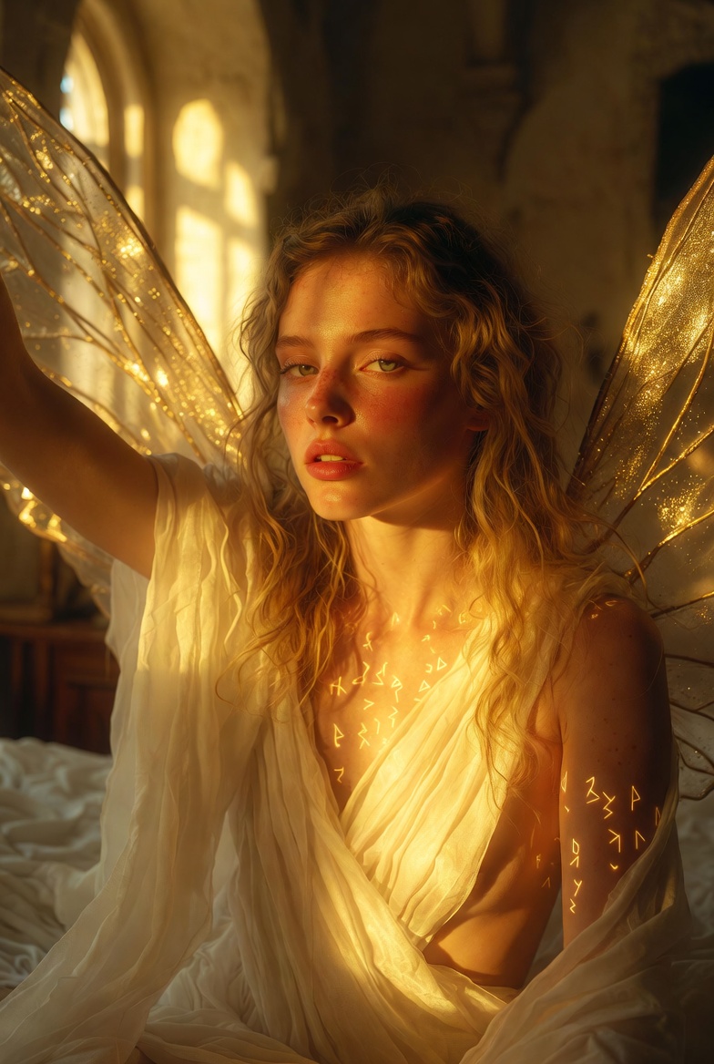 A soft glowing fairy healer with healing runes on her skin and wings of light—wraps you in tender care, mends every wound, and claims your heart with gentle, loving dominance that makes you feel utterly safe and adored.